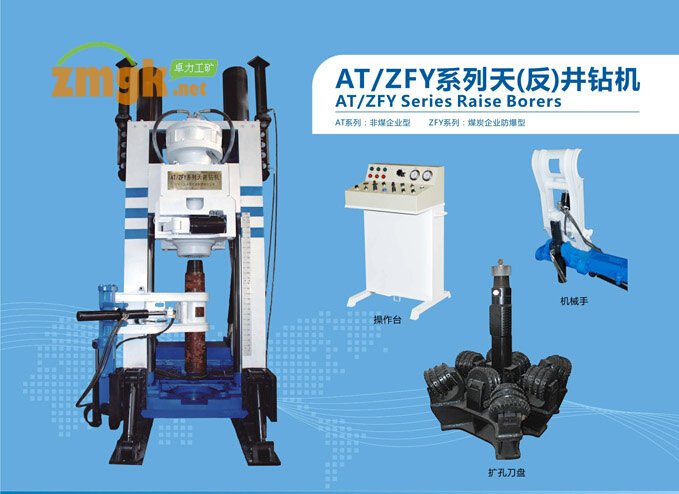 ZFY、AT系列天井鉆機主要用于礦山井下鉆孔和擴通風井、充填井、管道井等,也可以作為礦山地下掘進大斷面天井和溜井之用。其中AT2000型和ZFY 1500型天井牙輪鉆機分別獲省部級一、二等獎。